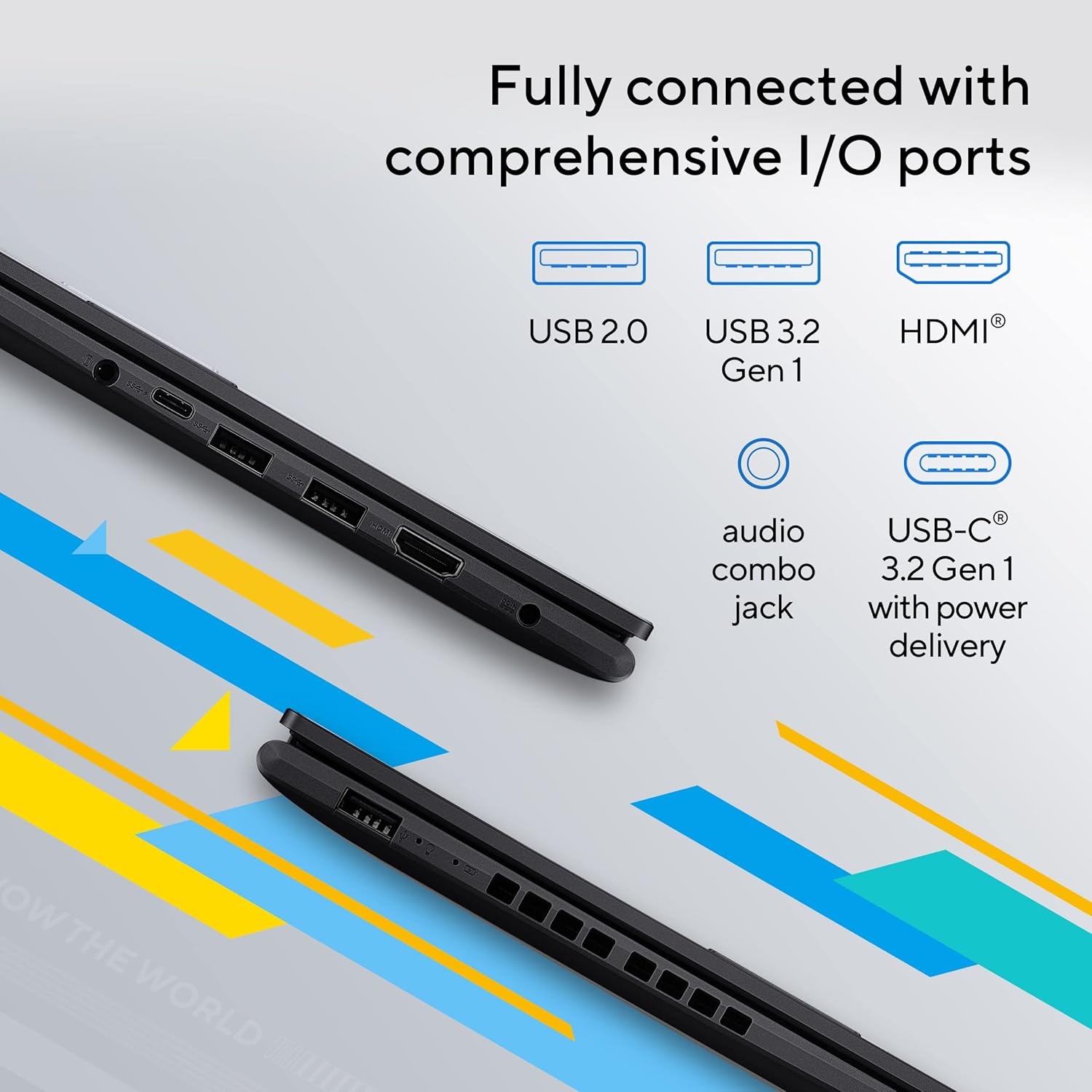 Vivobook 16 keeps you fully connected with its comprehensive I/O ports. There are a USB-C 3.2 Gen 1 PD port, two USB 3.2 Gen 1 Type-A ports, a USB 2.0 port, HDMI output, and an audio combo jack — so it’s easy to connect all your existing peripherals, displays, and projectors.