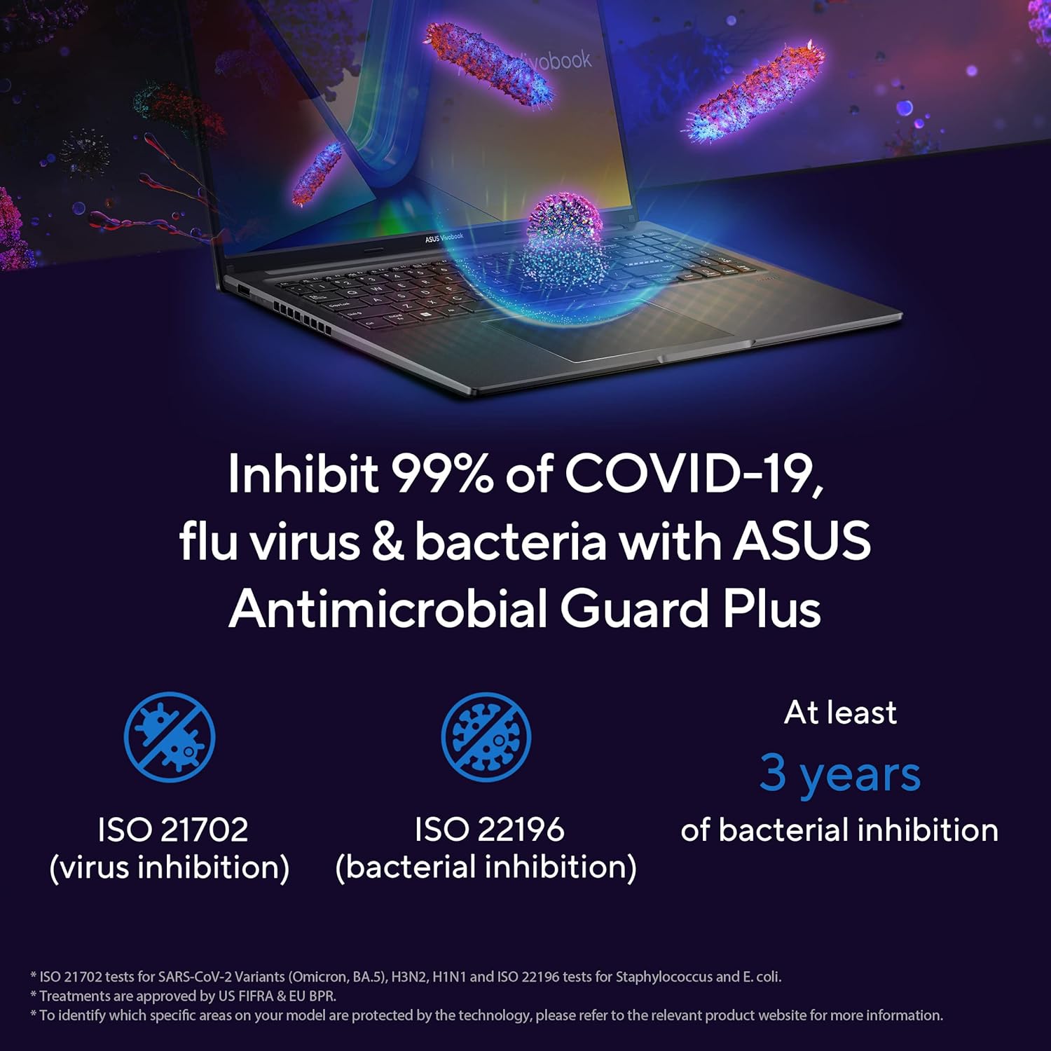 ASUS Antimicrobial Guard Plus is applied to frequently touched areas of your laptop to help keep it hygienic. This technology uses a denser treatment* that inhibits viruses and bacteria.