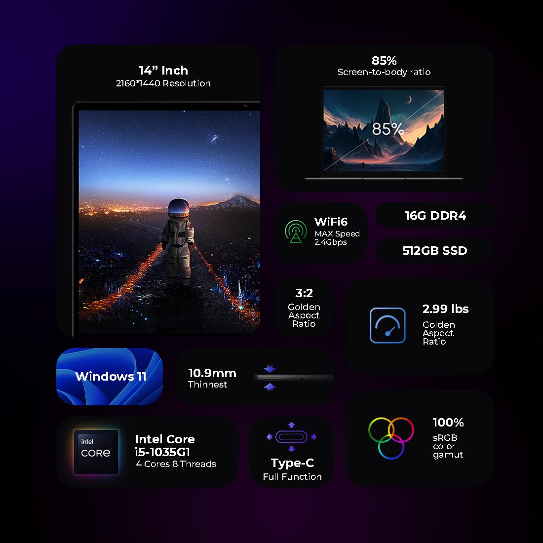 Intel Core i5 Laptop: Chuwi CoreBook X features an Intel Core i5-1035G1 processor with speeds up to 3.6GHz for seamless multitasking and fast processing. Quad-Core Oct Thread, 10nm technology ensures efficient performance.