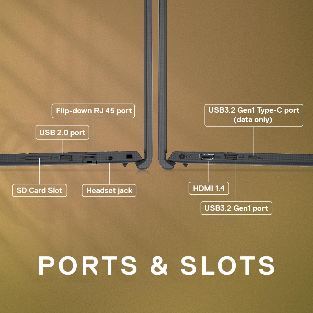 Ports: 1 USB3.2 Gen1 Type-C port, 1 USB3.2 Gen1 port, 1 USB 2.0 part, 1 Headset jack, 1 HDMI 1.4, 1 Flip-down RJ 45 port 10/100/1000 Mbps, 1 SD 3.0 card slot